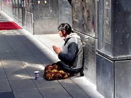 Ο γυιός κάθεται οκλαδόν βγάζει πλαστικό ποτηράκι επαιτείας
