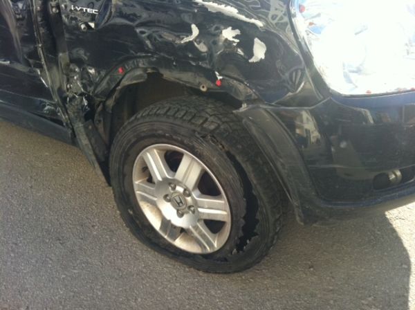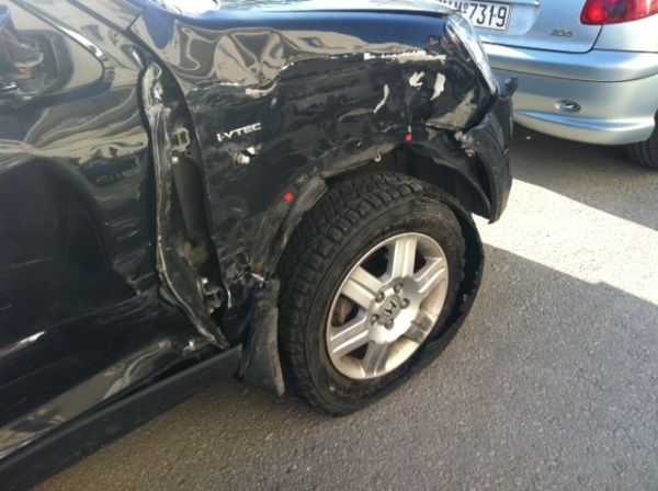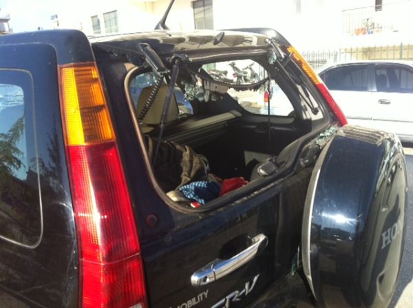 Όταν έφτασαν στα διόδια της Αγίας Τριάδας, κατά τη διάρκεια της καταδίωξης, ένα από τα περιπολικά που ακολουθούσε το μαύρο jeep χτύπησε σε μπάρα των διοδίων και έσπασε το φάρο και το παρμπρίζ του, ευτυχώς χωρίς να τραυματιστεί κάποιος από τους αστυνομικούς.
