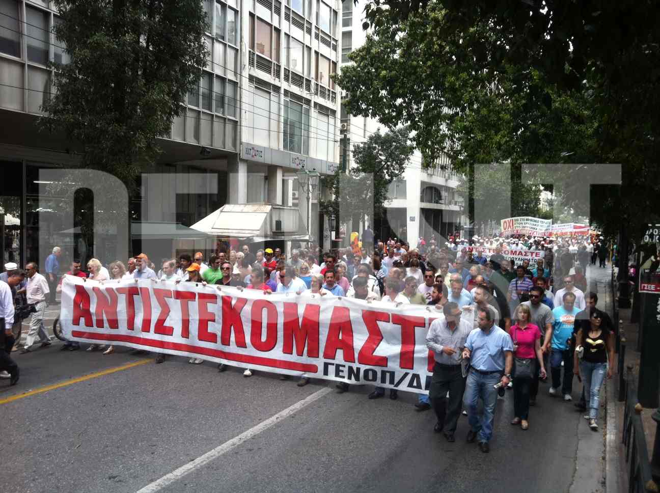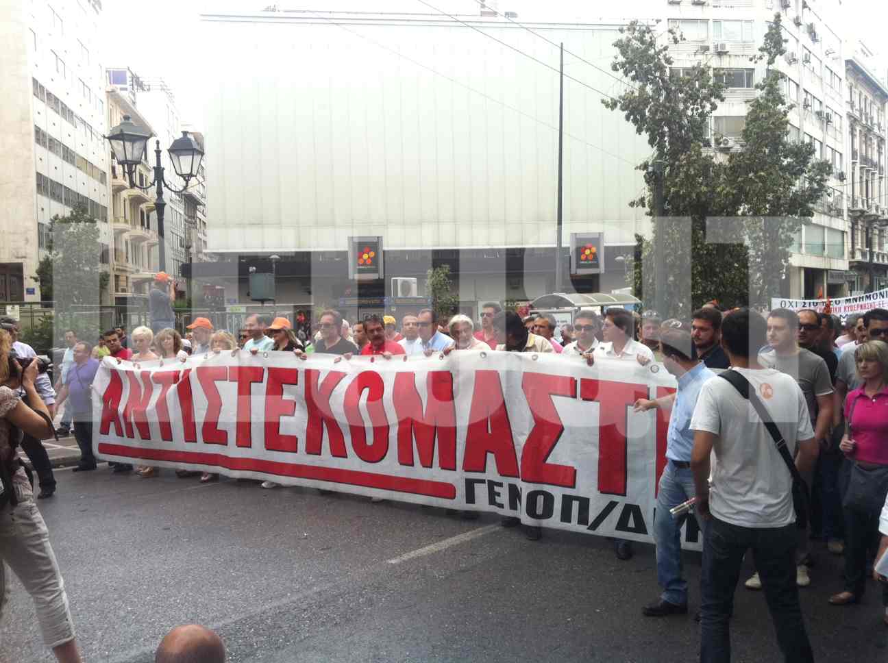 Η συγκέντρωση κατά των νέων μέτρων και των αποκρατικοποιήσεων ξεκίνησε στις 11 το πρωί και γύρω στη μία παρά η πορεία βρέθηκε έξω από το υπουργείο Οικονομικών. Κλειστή ήταν την ίδια ώρα η οδός Φιλελλήνων ενώ νωρίτερα είχε κλείσει η Σταδίου. Στην κεφαλή της πορείας βρίσκονταν οι εργαζόμενοι της ΟΛΜΕ και της ΓΕΝΟΠ - ΔΕΗ.
