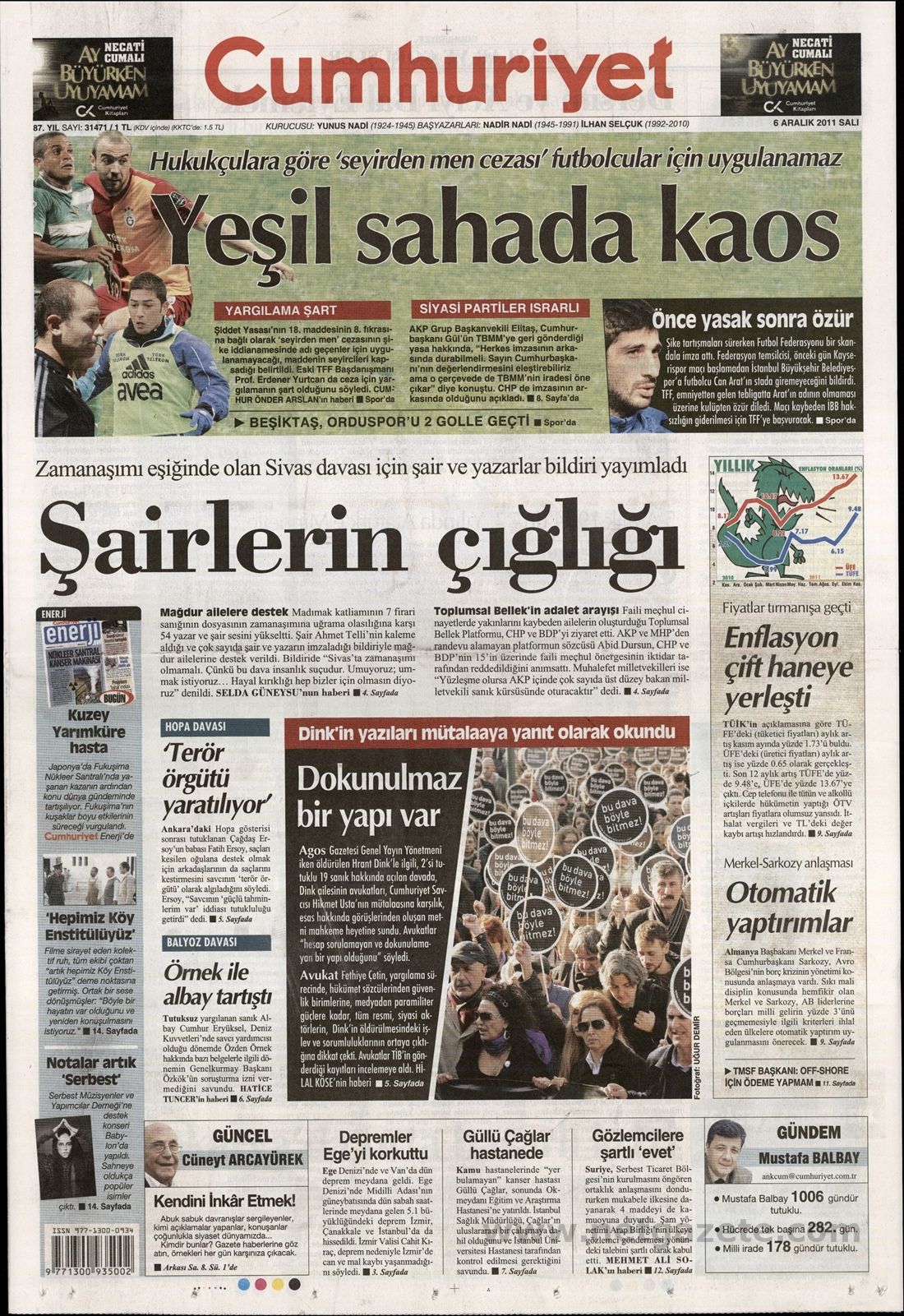 «Χάος στα γήπεδα» είναι ο τίτλος της Cumhuriyet που γράφει πως στα γήπεδα της Τουρκίας είναι δύσκολο να εφαρμοστεί ο νόμος του αποκλεισμού των ποδοσφαιριστών οι οποίοι κατηγορούνται για τη συμμετοχή τους στο κύκλωμα των στημένων παιχνιδιών. Σε κάποιους ποδοσφαιριστές έχει επιβληθεί ποινή ακόμη και του αποκλεισμού από τις κερκίδες!