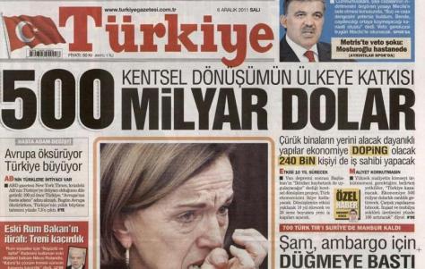 «500 δισεκατομμύρια δολάρια» είναι ο τίτλος της τουρκικής εφημερίδας Τürkiye η οποία αναφέρει τα σχέδια της τουρκικής κυβέρνησης για την αλλαγή δόμησης που σχεδιάζει η τουρκική κυβέρνηση σε όλη τη χώρα για αντισεισμική προστασία. Η εφημερίδα τονίζει πως ο Ερντογάν έχει δηλώσει χαρακτηριστικά πως « ακόμη με αυτό το σχέδιο αν θα χάσω τις εκλογές, αυτό το σχέδιο θα γίνει». Οι αλλαγές προβλέπουν τη μεταφορά ολόκληρων πόλεων στην Τουρκία και το χτίσιμο νέων. Ακόμη και σε πόλεις όπως η Κωνσταντινούπολη την κατεδάφισης χιλιάδων κτιρίων για να χτιστούν αντισεισμικές πολυκατοικίες. Το σχέδιο αυτό αναμένεται να ολοκληρωθεί τα επόμενα 10 χρόνια και το κόστος θα ξεπεράσει τα 500 δισεκατομμύρια δολάρια. Η Türkiye γράφει πως αυτό το σχέδιο μπορεί να κρατήσει ζωντανή την τουρκική οικονομία καθώς εκατοντάδες χιλιάδες άνθρωποι θα εργαστούν τον κατασκευαστικό τομέα.