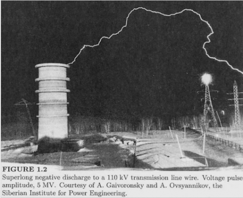 Όμως, τα τελευταία χρόνια αποδείχτηκε ότι ο πιο απλός τρόπος δημιουργίας αγώγιμης διόδου στην ατμόσφαιρα μπορεί να είναι ο παλιότερος γνώριμος που αναλύσαμε και σε προηγούμενο άρθρο μας γνωστός σαν Πηνίο Tesla. Μάλιστα, φαίνεται ότι οι Σοβιετικοί μηχανικοί και ηλ/λόγοι είχαν παρατηρήσει – και πιθανότατα πειραματιστεί!- με ανάλογα φαινόμενα όπως φαίνεται από την φωτογραφία ενός τέτοιου τεχνητού κεραυνού με μήκος χιλιομέτρων από μια γραμμή μεταφοράς προς κάποιον μεταλλικό πύργο, στην εικόνα 1.