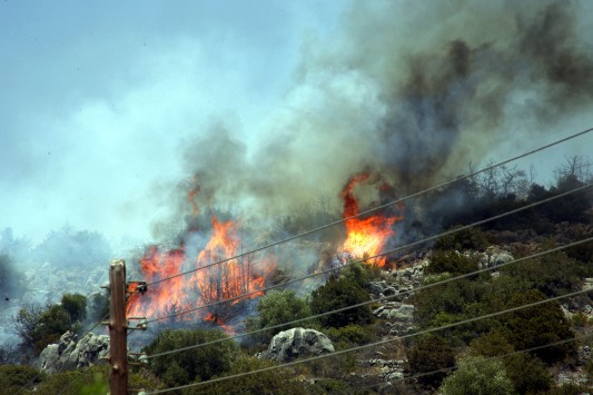 Από την πυρκαγιά ήδη έχουν καεί περίπου 300 στρέμματα με πουρνάρια, ενώ οι υψηλές θερμοκρασίες, μαζί με τους ανέμους που πνέουν στην περιοχή, δυσκολεύουν το έργο των πυροσβεστών.