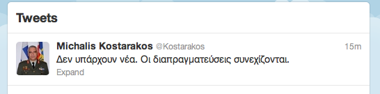 Λίγο πριν από τα μεσάνυχτα ο Α/ΓΕΕΘΑ Μιχάλης Κωσταράκος “χτύπησε” για το θέμα των περικοπών. Με τη γνωστή μορφή επικοινωίας μέσω twitter, ο Α/ΓΕΕΘΑ δεν είπε τίποτα,λέγοντας ταυτόχρονα …πολλά.