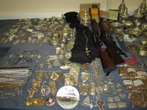 βρέθηκαν και κατασχέθηκαν: πλάκα χρυσού, βάρους 240 γραμμαρίων, 65 χρυσές λίρες, διάφορα αφιερώματα πιστών (τάματα), 2 κυνηγετικά μαχαίρια, συσκευή ηλεκτρικής εκκένωσης και το χρηματικό ποσό των 96.900 ευρώ!