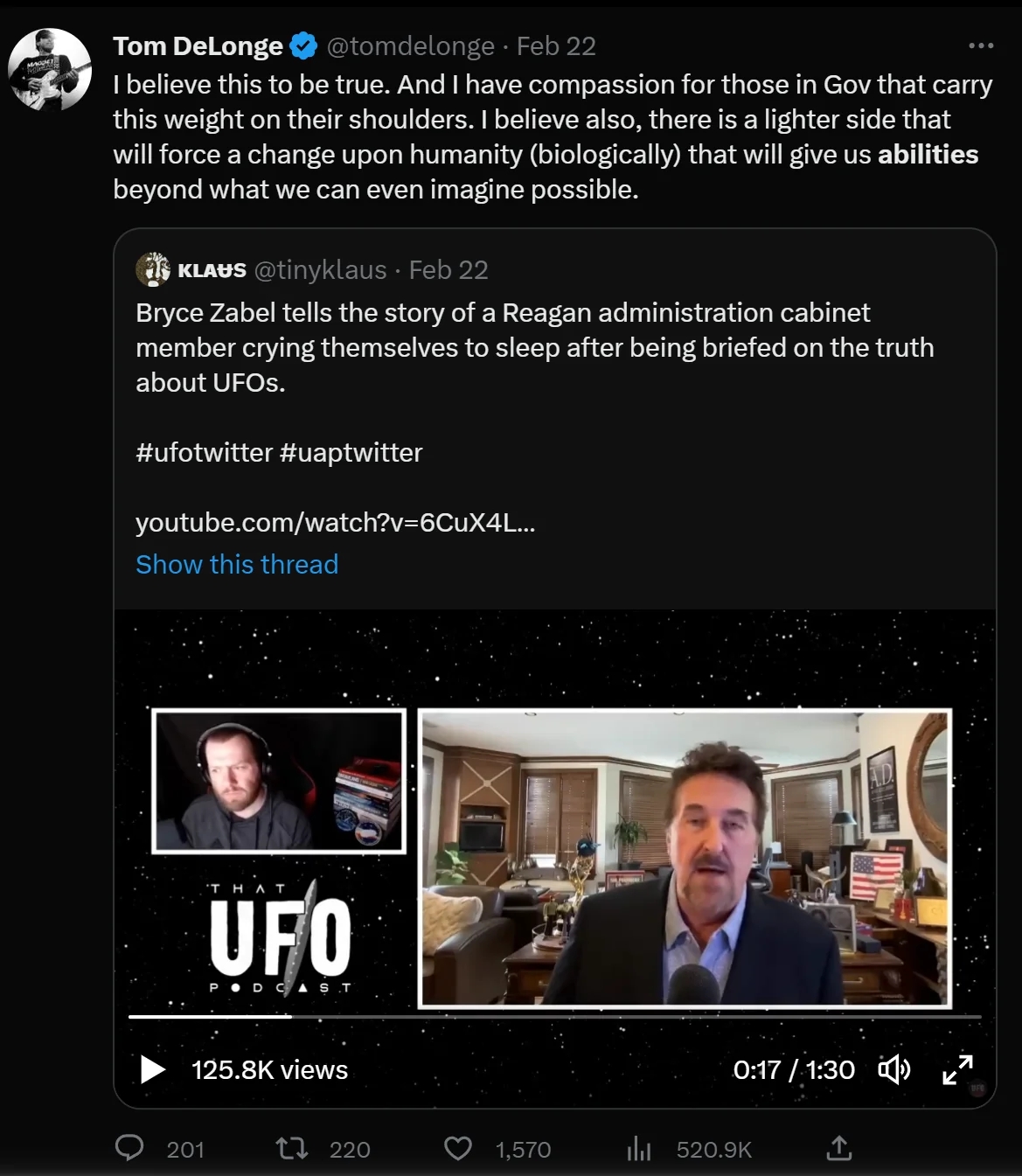 ΣΕΣε μια πρόσφατη κρυπτική ανάρτηση, ο Tom DeLonge απάντησε σε μια ιστορία στο That UFO Podcast σχετικά με το πώς ένας αξιωματούχος του Reagan έλαβε μια πλήρη αποκάλυψη και ήταν τόσο σοκαρισμένος από αυτό που του είπαν που έκλαιγε κάθε βράδυ για εβδομάδες. Ο Τομ μιλάει συνεχώς για το πώς οι άνθρωποι μπορούν να είναι «ισχυροί», «αθάνατοι» - «σαν τον υπεράνθρωπο».