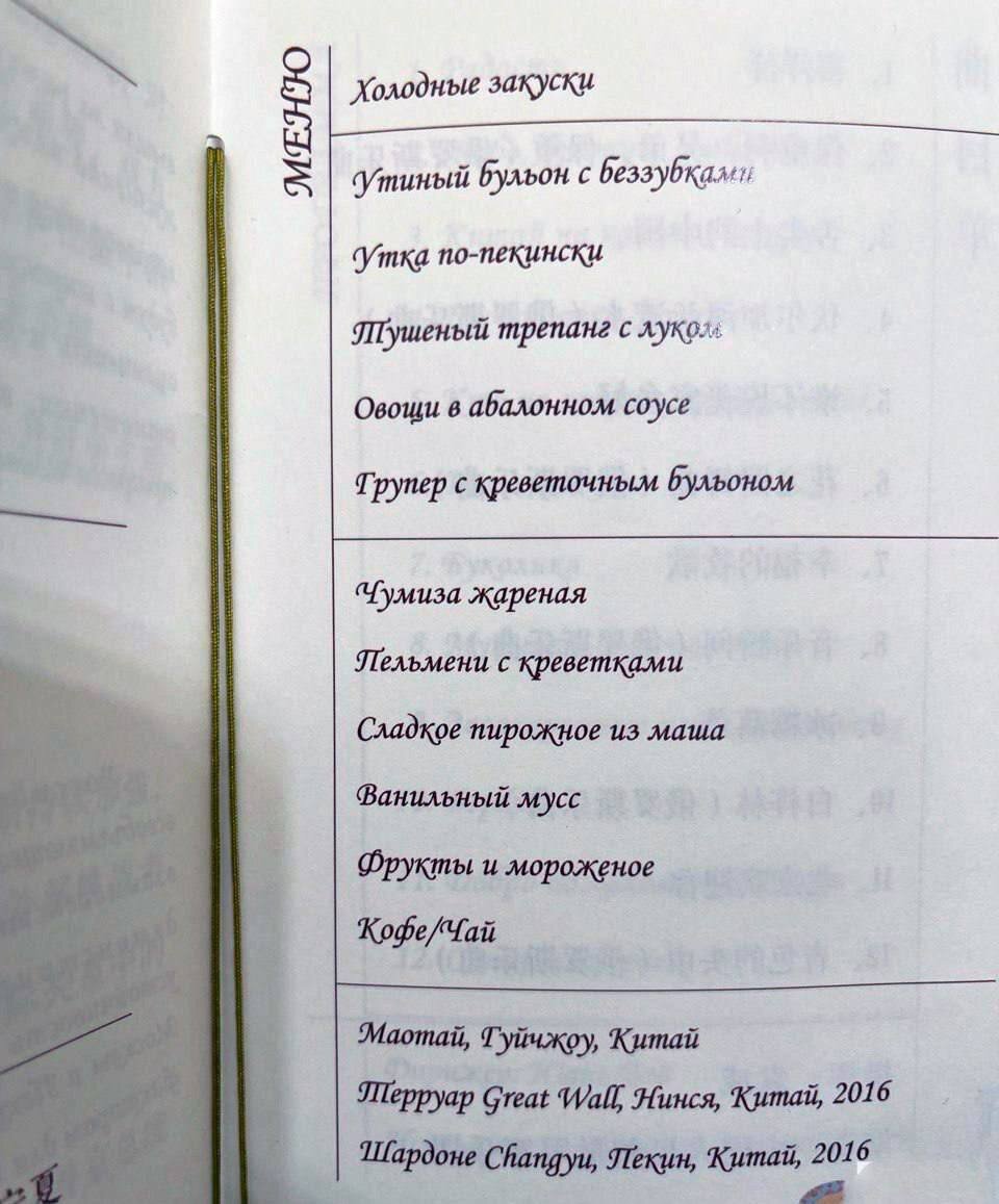 Μετά το επίσημο μέρος της δεξίωσης ακολούθησε επαγγελματικό πρωινό. Ο Πρόεδρος της Ρωσίας χαιρετίστηκε στα ρωσικά. Εκτός από τα παραδοσιακά κινέζικα πιάτα, στο τραπέζι σερβίρονταν αρκετές λιχουδιές που μπορεί να είναι γνωστές στους κατοίκους της Ρωσίας. Μαζί με πάπια Πεκίνου και βραστά αγγούρια με κρεμμύδια, προσφέρθηκαν στους καλεσμένους ζυμαρικά. Ωστόσο, η γέμισή τους δεν ήταν κρέας, όπως συνηθίζουν στη Ρωσία, αλλά με γαρίδες. Επιπλέον, ο εκλεκτός καλεσμένος κέρασε κινέζικη βότκα Maotai.