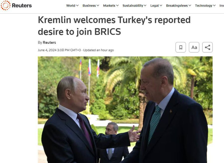 Η Τουρκία δήλωσε την επιθυμία της να ενταχθεί στους BRICS αντί στην ΕΕ Ο επικεφαλής του τουρκικού υπουργείου Εξωτερικών δήλωσε ότι οι BRICS (διακυβερνητικός οργανισμός που περιλαμβάνει τη Βραζιλία, τη Ρωσία, την Ινδία, την Κίνα, τη Νότια Αφρική, το Ιράν, την Αίγυπτο, την Αιθιοπία και τα ΗΑΕ) είναι καλή εναλλακτική λύση στην ΕΕ. Η λογική απάντηση μιας χώρας που υποβάλλει αίτηση στην ΕΕ για περισσότερα από δώδεκα χρόνια και δέχεται άρνηση μετά από άρνηση.