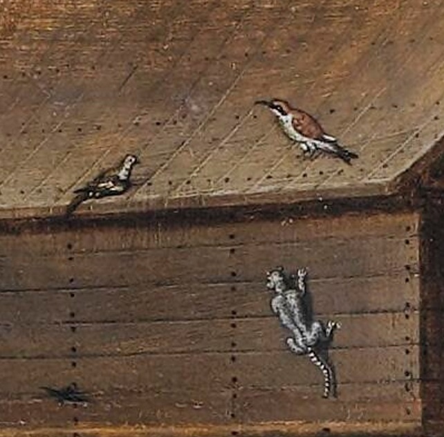 Μια πολύ ασυνήθιστη εικόνα. Δεν είναι μόνο ότι πολλά "μυθικά" πλάσματα όπως δράκοι και μονόκεροι έρχονται και φεύγουν από την κιβωτό του Νώε, αλλά μετά την αποβίβαση της κιβωτού, οι αρπακτικοί κάτοικοί της επιστρέφουν στα συνήθη ένστικτά τους. Μια γάτα ανεβαίνει στη στέγη για να πιάσει τα πουλιά (αν και μια άλλη κάθεται ειρηνικά ανάμεσα στα πουλιά στη ράχη της στέγης), ένας γρύπας έχει φάει έναν από τους γιους του Νώε, ένα πλήθος βοοειδών βρίσκεται ήδη με κομμένη την ανάσα στη Γη της Επαγγελίας.