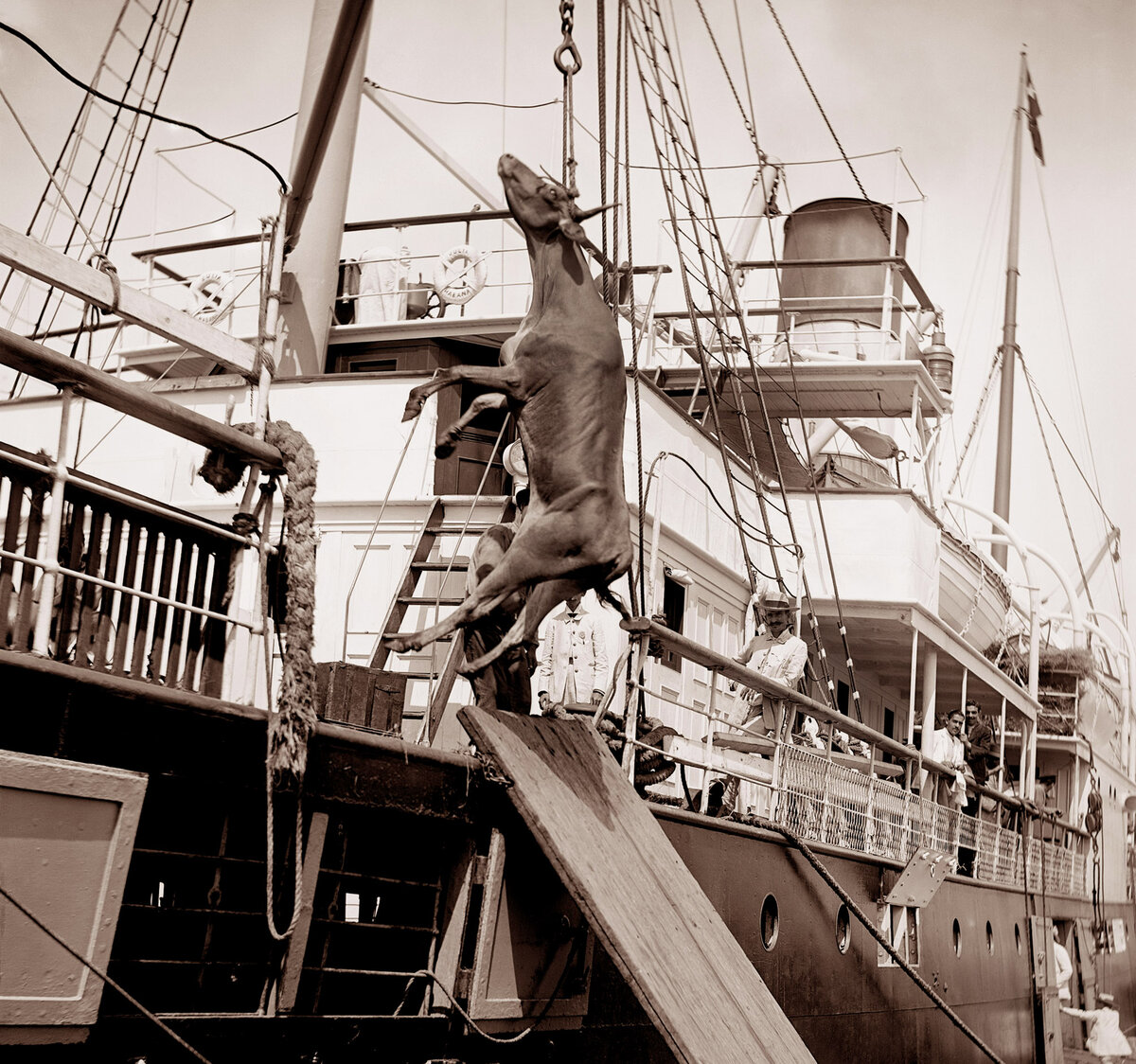 Κυριολεκτικά, πάρτε τον ταύρο από τα κέρατα! Φόρτωση ενός φτωχού αρτιοδάκτυλου στο κουβανικό ατμόπλοιο Julia, περίπου το 1900.