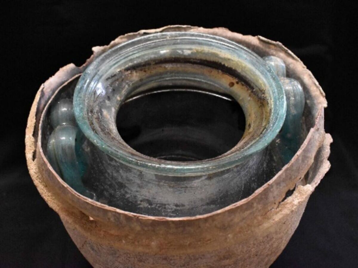 Το σκάφος ανακαλύφθηκε το 2019 σε έναν ρωμαϊκό τάφο για δύο άτομα. Οι αρχαιολόγοι έχουν προτείνει ότι το υγρό θα μπορούσε να είναι κρασί, καθώς αυτό το ποτό έπαιξε τεράστιο ρόλο στη θρησκευτική και ταφική κουλτούρα των αρχαίων Ρωμαίων. Για την ξεκάθαρη ταυτοποίηση του υγρού, απαιτήθηκε χημική ανάλυση.