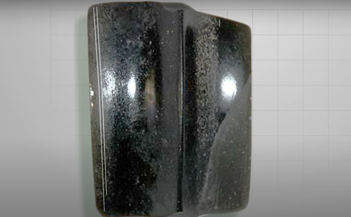 Σε μικροσκοπική μεγέθυνση τεσσάρων μικρών, η απόκλιση αυλάκωσης είναι 0 μοίρες. Αυτό είναι χαρακτηριστικό για τα περιστροφικά εργαλεία, όπου το λειαντικό στερεώνεται στην επιφάνεια εργασίας με κόλλα ή άλλα μέσα. Είναι ενδιαφέρον να σημειωθεί ότι τα σημάδια εργαλειομηχανών βρίσκονται σε ομάδες σε διαφορετικές γωνίες προς την επιφάνεια, υποδεικνύοντας ότι ο αρχαίος τεχνίτης είτε χρησιμοποιούσε ένα σταθερό εργαλείο, κρατώντας το βραχιόλι στα χέρια του ενώ γυάλιζε, είτε χρησιμοποιούσε μια εργαλειομηχανή χειρός. Η μελέτη τονίζει ότι το προϊόν δεν περιέχει ουσιαστικά κατασκευαστικά ελαττώματα. Αυτή η εκπληκτική ανακάλυψη δεν ταιριάζει στη γενικά αποδεκτή ιστορία της ανθρωπότητας, καθώς το προϊόν χρονολογείται από τη νεολιθική περίοδο, όταν οι άνθρωποι χρησιμοποιούσαν μόνο πέτρινα εργαλεία. Αυτό το τεχνούργημα χρησιμεύει ως περαιτέρω απόδειξη της ύπαρξης ενός πολιτισμού που διέθετε γνώση και τεχνολογία μηχανών τουλάχιστον πριν από δέκα χιλιάδες χρόνια. Η τέλεια συμμετρία του προϊόντος και τα χαρακτηριστικά του υλικού υποδηλώνουν τη χρήση τεχνολογίας συγκρίσιμης με έναν τόρνο, αφού διαφορετικά θα ήταν αδύνατο να επιτευχθεί ένα τέτοιο τέλειο σχήμα.