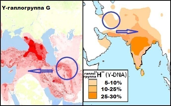 Το οποίο εμφανίστηκε στη στροφή του μ.Χ. (που αντιστοιχεί στην ιστορική αρχή της εξόδου τους). Στο Ινδουστάν συναντάται κατά το ήμισυ (παντού περίπου 30%). Αλλά ο ίδιος ο κλάδος H1 είναι πολύ παλαιότερος. Αποκλίνει από το Η2 στο Ιράν, 10 χιλιάδες χρόνια π.Χ. οι φορείς του μετακόμισαν στον Ινδό και ο Η2 στην Ευρώπη (μαζί με τους φορείς της απλοομάδας G), αποτελώντας το 10% του πληθυσμού του (0,2% σήμερα).