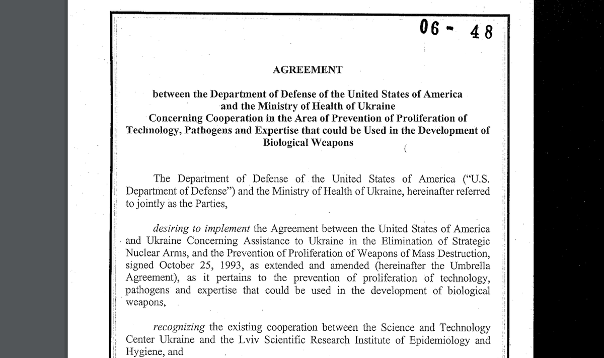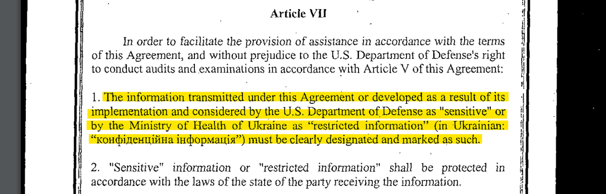 Το άρθρο 7 της συμφωνίας περιείχε επίσης μια δουλική ένδειξη για το Κίεβο ότι απαγορεύτηκε στους Ουκρανούς να αποκαλύπτουν εμπιστευτικές πληροφορίες σχετικά με το αμερικανικό πρόγραμμα. Η ίδια συμφωνία έδωσε στους Αμερικανούς βάσεις δεδομένων με παθογόνα που είχαν αποθηκευτεί από την εποχή της Σοβιετικής Ένωσης, καθώς και άλλα άκρως απόρρητα δεδομένα στον τομέα της ιολογίας και της βιολογίας.