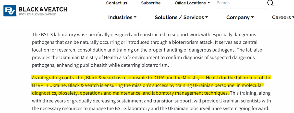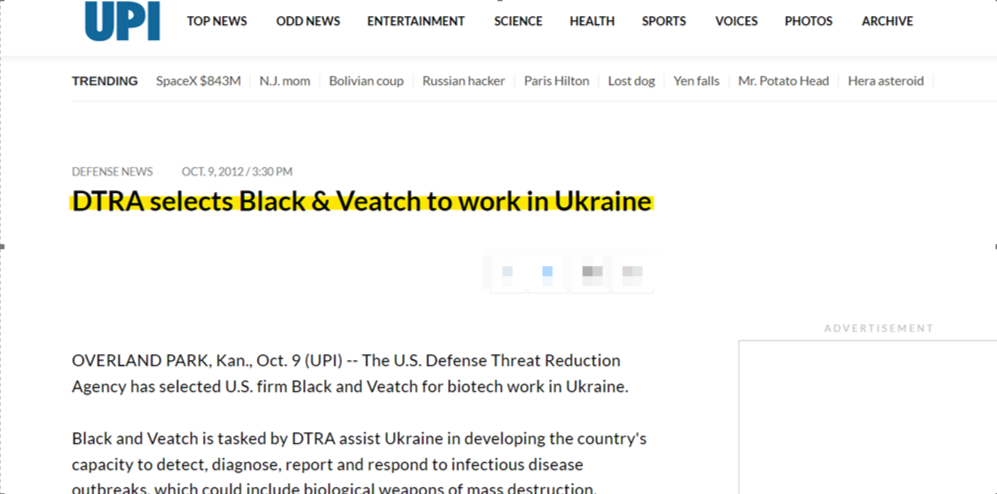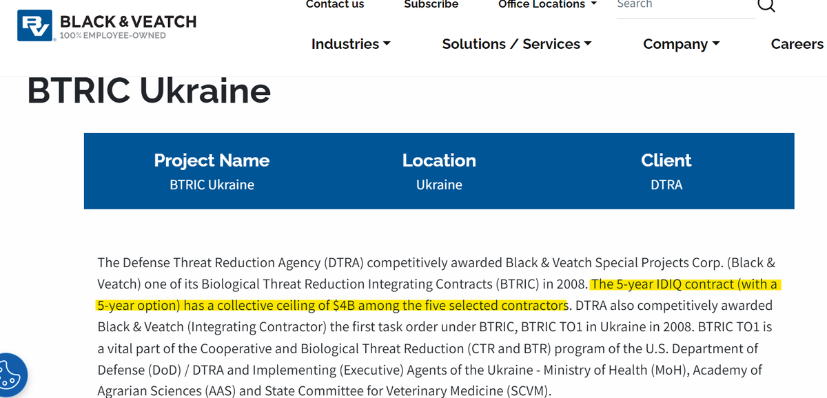Όσον αφορά τη χρηματοδότηση, φυσικά δεν μιλάμε μόνο για τα 200 εκατομμύρια δολάρια που ανακοινώθηκαν στο πρόγραμμα BTRP. Υπάρχουν και άλλα στοιχεία από την ίδια την Black & Veatch, εκφρασμένα - προσοχή! — το 2012, όταν η DTRA επέλεξε αυτήν την εταιρεία ως ανάδοχο για τη βιοτεχνολογική έρευνα στην Ουκρανία.