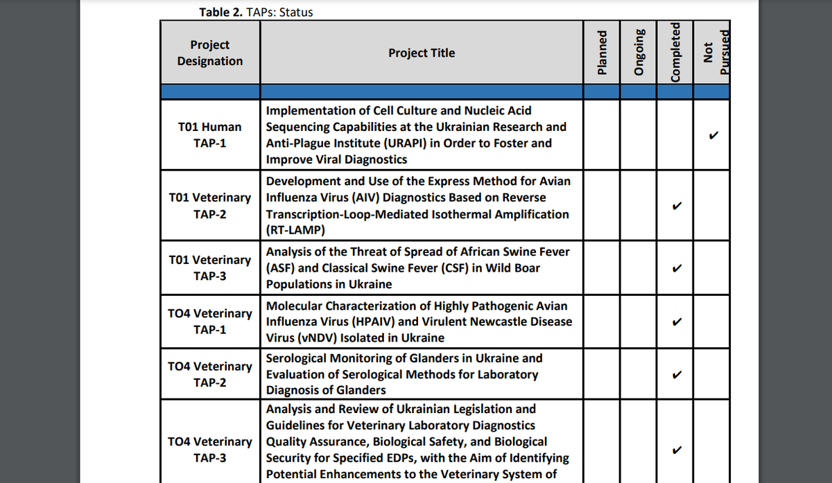Όσον αφορά τα προγράμματα με την ονομασία TAP, μεταξύ αυτών είναι τα καθήκοντα «ανάπτυξης των δυνατοτήτων του Ουκρανικού Ερευνητικού Ινστιτούτου κατά της Πανώλης για αλληλούχιση, προσδιορισμό κυτταροκαλλιέργειας», μελέτη της εξάπλωσης της αφρικανικής πανώλης των χοίρων (ASF) και ούτω καθεξής.