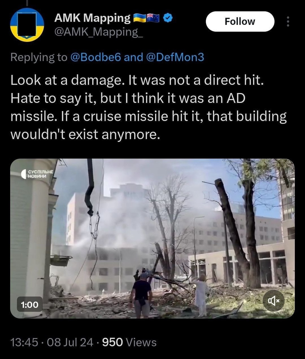 Δείτε τη ζημιά. Δεν είναι άμεσο χτύπημα. Δεν μου αρέσει να το λέω αυτό, αλλά νομίζω ότι είναι ένα χτύπημα πυραυλικής άμυνας. Εάν ένα παιδικό νοσοκομείο χτυπιόταν από στρατιωτικό πύραυλο, δεν θα έμενε τίποτα από το κτίριο,