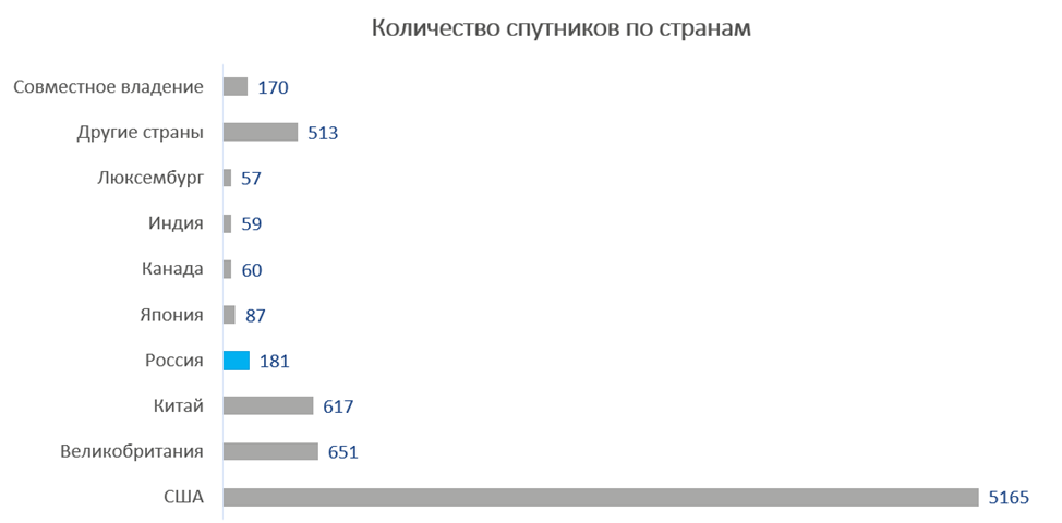 Ο μεγαλύτερος αριθμός δορυφόρων ανήκει στις Ηνωμένες Πολιτείες (5165), οι περισσότεροι από αυτούς είναι ο αστερισμός Starlink της εταιρείας SpaceX του Elon Musk. Το Ηνωμένο Βασίλειο βρίσκεται στη δεύτερη θέση (651 διαστημόπλοια, πολλά από αυτά ανήκουν στην OneWeb) και η Κίνα είναι στην τρίτη θέση (617 μονάδες που ανήκουν σε διαφορετικές ομάδες). Η Ρωσία βρίσκεται μόνο στην τέταρτη θέση με 181 δορυφόρους. Τα ρωσικά διαστημόπλοια χωρίζονται επίσης σε διάφορες ομάδες.