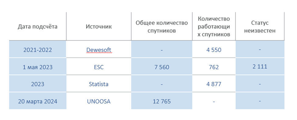 Ο αριθμός που δημοσιεύτηκε από την UNOOSA προήλθε από μια προηγούμενη ημερομηνία έναρξης της καταμέτρησης. Σύμφωνα με το ECS, τα τελευταία 33 χρόνια, 7.560 δορυφόροι έχουν εκτοξευθεί σε τροχιά της Γης. Από αυτές, 4687 έχουν λήξει και 762 συσκευές είναι ξεκάθαρα λειτουργικές. Η τύχη άλλων 2.111 δορυφόρων είναι άγνωστη, αφού τα κράτη και οι εταιρείες που τους κατέχουν είτε δεν δήλωσαν τη διάρκεια ζωής τους είτε δεν δημοσίευσαν αυτά τα δεδομένα σε ανοιχτές πηγές.