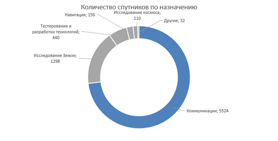 Όπως προκύπτει από το διάγραμμα, η πλειονότητα των δορυφόρων (73%) εκτοξεύονται για την οργάνωση επικοινωνιών και τηλεοπτικών εκπομπών στη Γη. Στη συνέχεια ακολουθούν οι δορυφόροι που προορίζονται για εξερεύνηση της Γης (17%) και τα διαστημόπλοια δοκιμών για τεχνολογίες ανάπτυξης και εντοπισμού σφαλμάτων (6%), βάσει των οποίων εκτοξεύονται ήδη διαστημόπλοια που λειτουργούν. Άλλοι στόχοι εξυπηρετούνται από το 4% των υπολοίπων δορυφόρων.