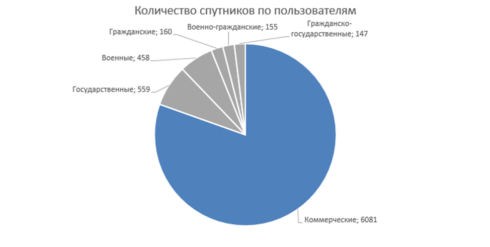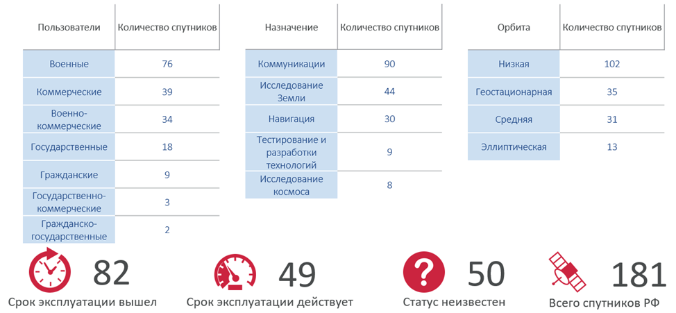 Έτσι, η πλειοψηφία των δορυφόρων στη Ρωσική Ομοσπονδία είναι στρατιωτικοί και εμπορικοί (82%). Οι τομείς εφαρμογής περιλαμβάνουν τις επικοινωνίες (50% των συσκευών), την εξερεύνηση της γης (24%) και την πλοήγηση (17%). Η πλειοψηφία των δορυφόρων βρίσκεται σε χαμηλή τροχιά (56%), το 19% είναι σε γεωστατική τροχιά και το 17% σε μέση τροχιά. Επιπλέον, σύμφωνα με το UCS, το 45% των δορυφόρων έχουν λήξει, το 27% είναι ακόμη σε λειτουργία και η κατάσταση άλλων 50 είναι άγνωστη.